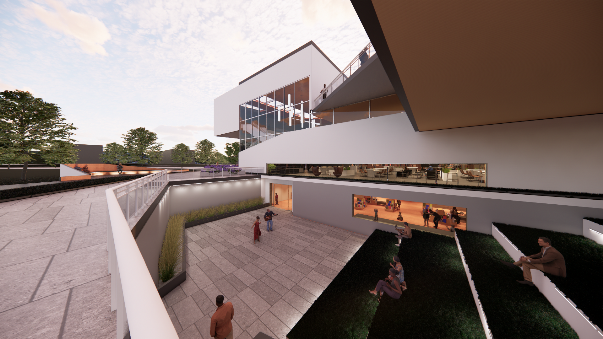 Elmwood Central Park is a commonly overlooked landscape. As a way to bring more people to this site, EPCL incorporates large moves that can be seen from afar. Irregular and concave shapes (that are similar to the park’s boundary lines) are used to redirect pedestrian circulation in, around, and directly through the project. From this, the project creates visual slight lines that embrace the aesthetic nature of the park, while providing accessible gathering spaces for all. The experience of EPCL is a way to respond to the evolution of a library, while being a mixed-use asset for the community.