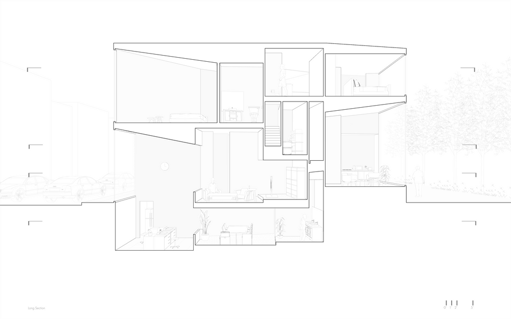 In designing an urban retreat, this project claims that its identity should come from its surrounding urban environment. As a result, this project can be interpreted as ex¬tensions of the street, the alleyway, the residential building on the north side, and the service building on the south side, all extending into a mass in the urban site and carve out the mass into habitable spaces that are the volumetric extension of the surroundings. This project proposes a new way of living that, rather than traveling through rooms, the inhabitant of this project is traveling through facades that defines the urban landscape as it is; rather than living in the house, the inhabitant is truly living in the urban landscape.