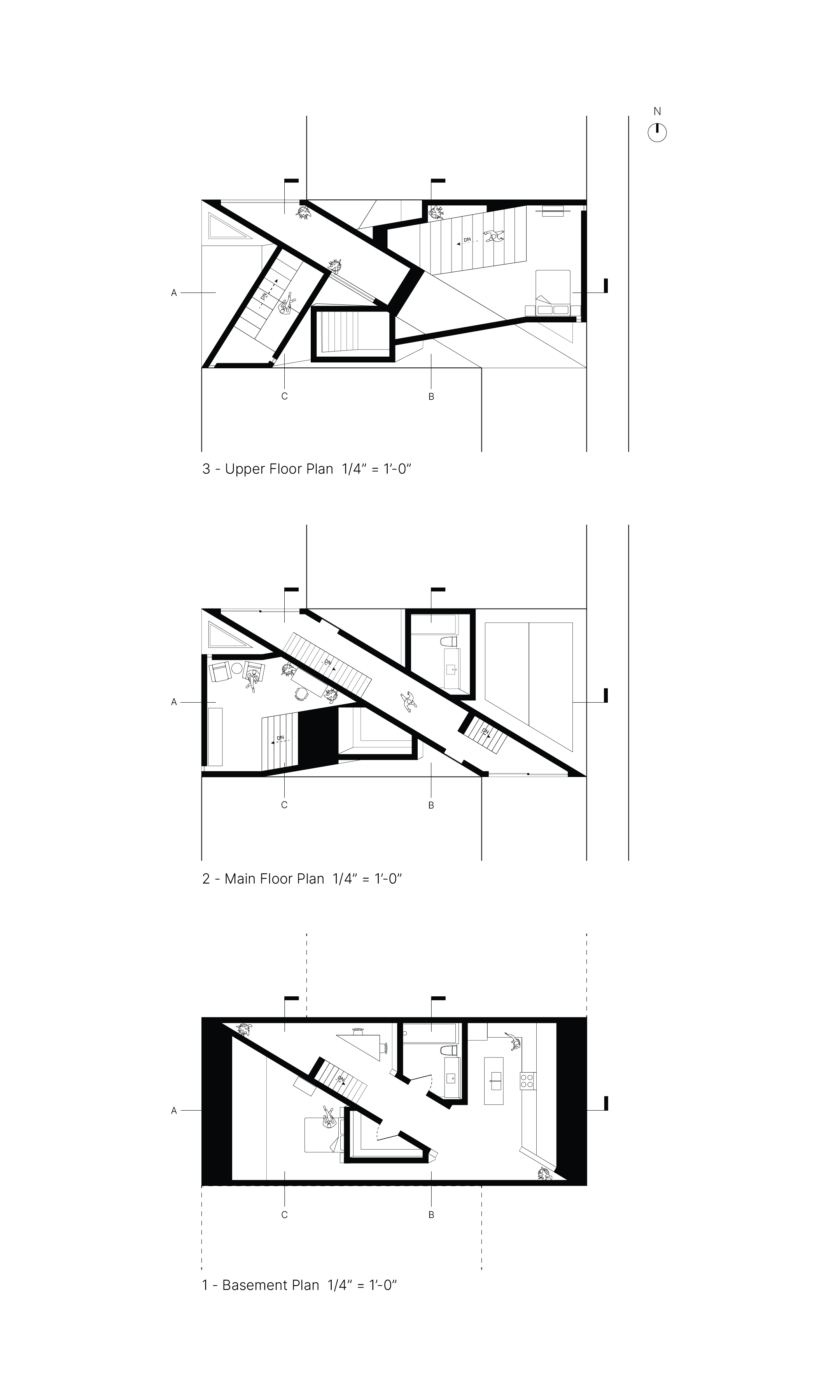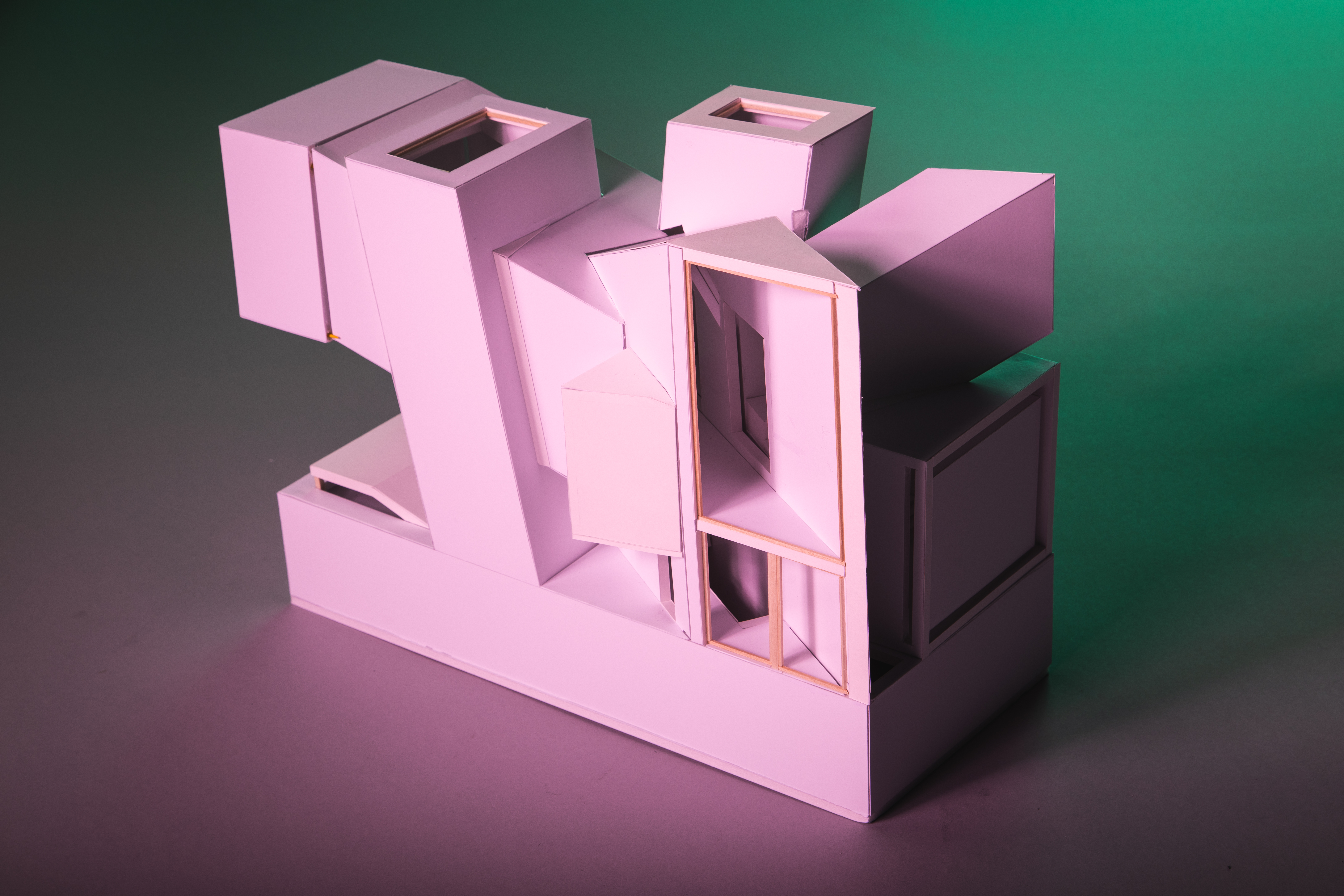 Through geometric explorations of how light is constructed, the house challenges the perception of needing a lot of openings to make a space light up. By contrasting the public circulation of the central slash and the jagged private spaces intersecting with the core, this produces a particular spatial connection that allows inhabitants to identify the program’s organization.